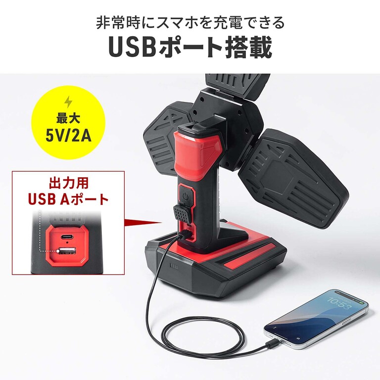 本体のUSBポートを使ってスマートフォンなどの充電も可能。停電時やアウトドアでの心強い電源代替手段としても安心して使える。
