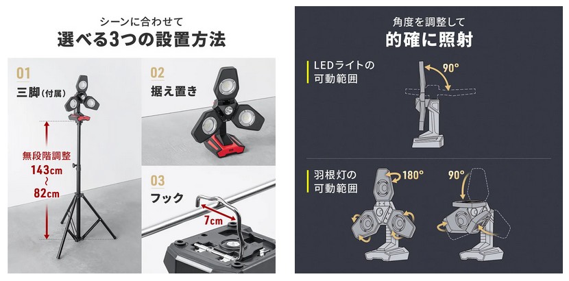 付属の三脚で高所からの照射も可能。地面にそのまま置いたり、フックで吊り下げたり、設置スタイルは自由自在。現場やシーンに応じて最適な照明ポジションを選べる。