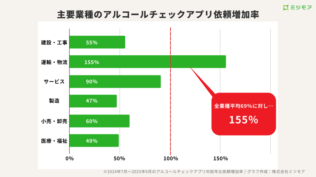 昨年から今年にかけて、アルコールチェックアプリの導入依頼数は全体で前年対比69%と減少傾向だが、運輸・物流業界においては前年比155%と突出した伸びを示している。