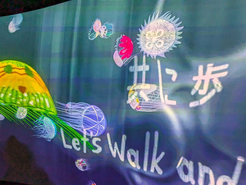 この展示では、360度を取り囲む映像と音響が来場者を包み込む、全身没入型の空間が広がる。序盤では、子どもたちが描いたクラゲたちが映像として登場し、来場者は彼らと共に「いのちの誕生」や「雄大な自然の風景」を旅する。まるで原始生物クラゲとともに、時空を超えて生命の始まりへといざなわれるような感覚を味わえる。