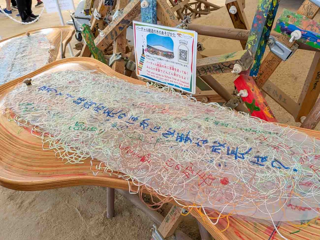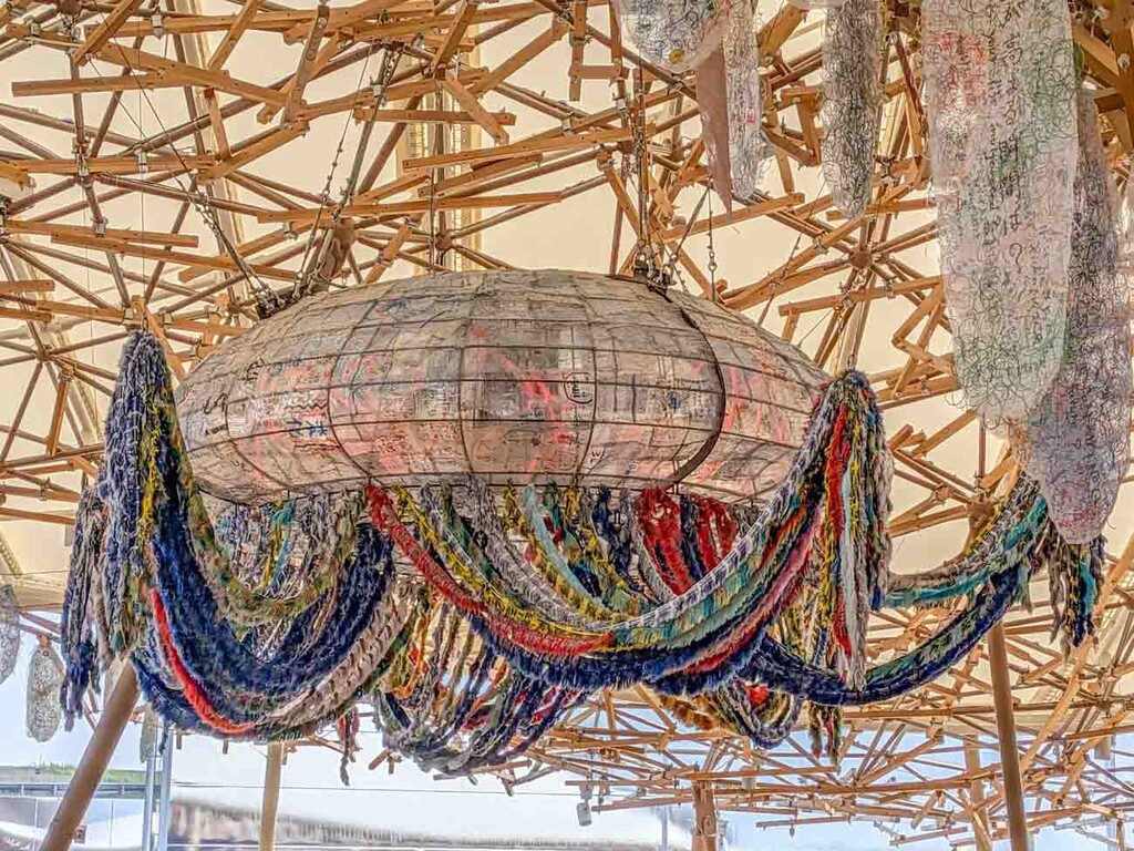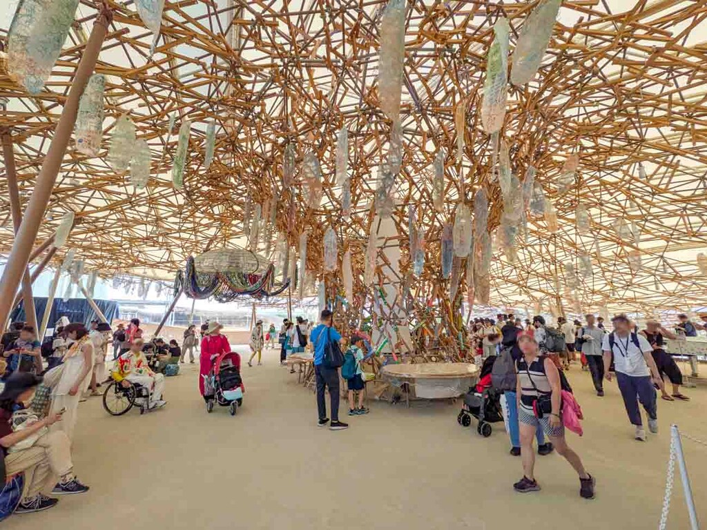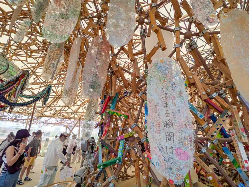 その《創造の木》は、たくさんの短冊がゆらめく巨大な造形物。風に揺れる一枚一枚が人々の願いや価値観の象徴であり、まるでクラゲの触手のようにやさしく空間を彩っている。自分の思いが空間の一部になる感覚は、訪れた人に強い印象を残すだろう。