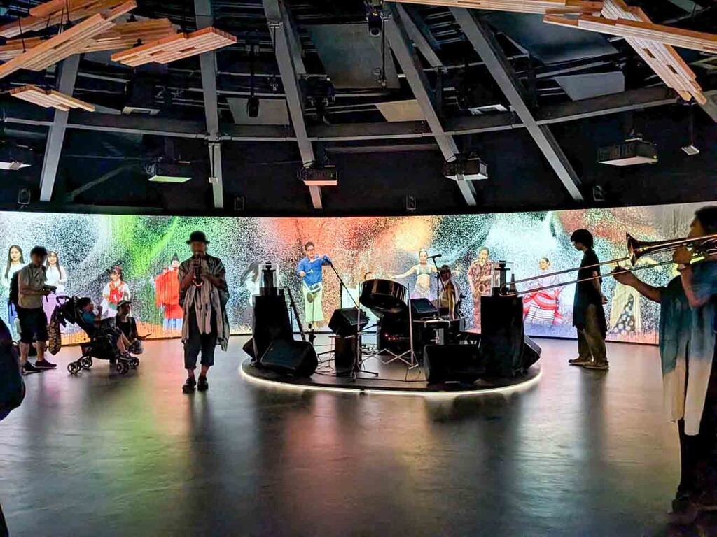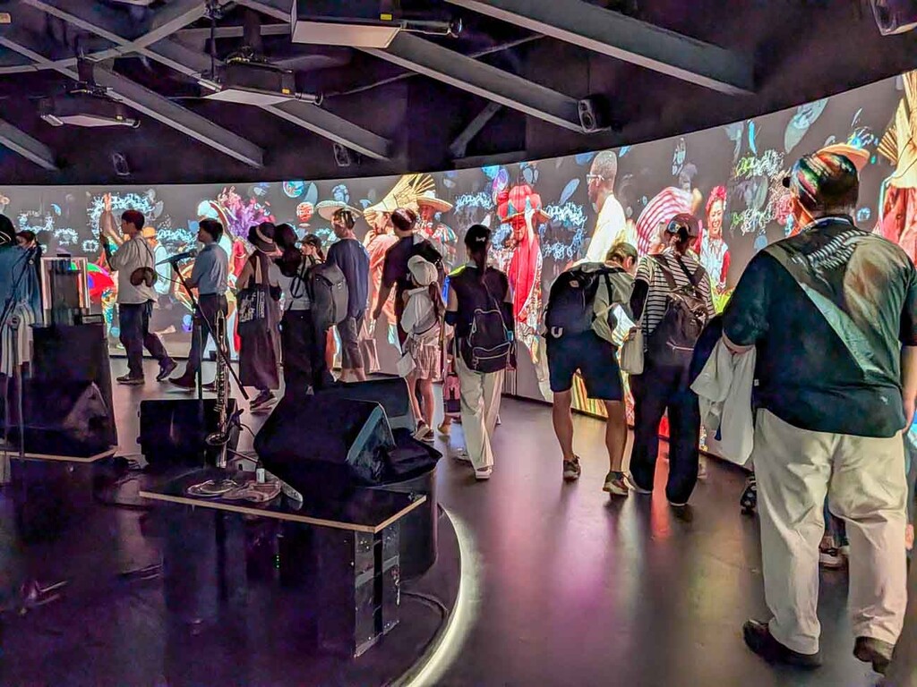 さらに特筆すべきは、常時2名以上の音楽家による生演奏だ。映像と音楽がシンクロしながら、「いのちの旅」(作曲:中島)に乗せた即興のライブ演奏が空間全体を盛り上げる。観客自身も歩いたり踊ったりしながら、展示の一部として“いのちの祝祭”を共に創り上げていく。