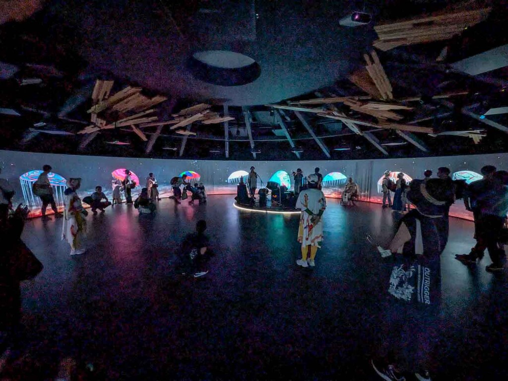 座る位置によって聴こえる音が変化する構造もユニークだ。北海道・メムの森で揺れる木々のざわめき、佐渡島の焚き火のはぜる音、ベトナムのカエルの鳴き声などが、まるでその場所にいるかのように響き渡る。そして、フィナーレを飾るのはゴングの音が空間を回るように響く圧巻の演出。