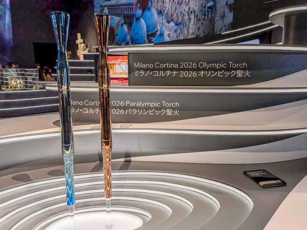 もう一つは、2026年のミラノ・コルティナ冬季オリンピックおよびパラリンピックの聖火トーチ。青緑とブロンズの美しいフォルムが特徴のトーチは、スポーツと平和、希望のシンボルとして展示されている。イタリアが世界に誇る次世代イベントの精神を、このパビリオンで先取りすることができる。