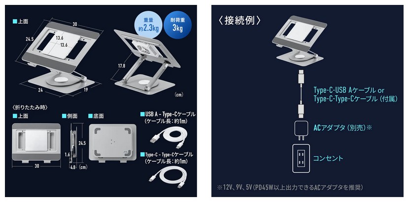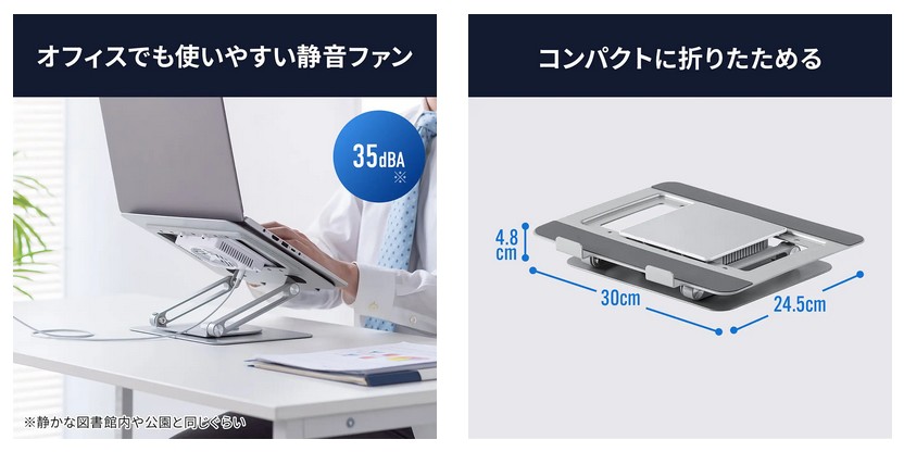 ファン稼働時でも静音性は35dBと静かで、オフィスや深夜の作業も快適になる。使わないときはコンパクトに折りたためるのもポイントだ。