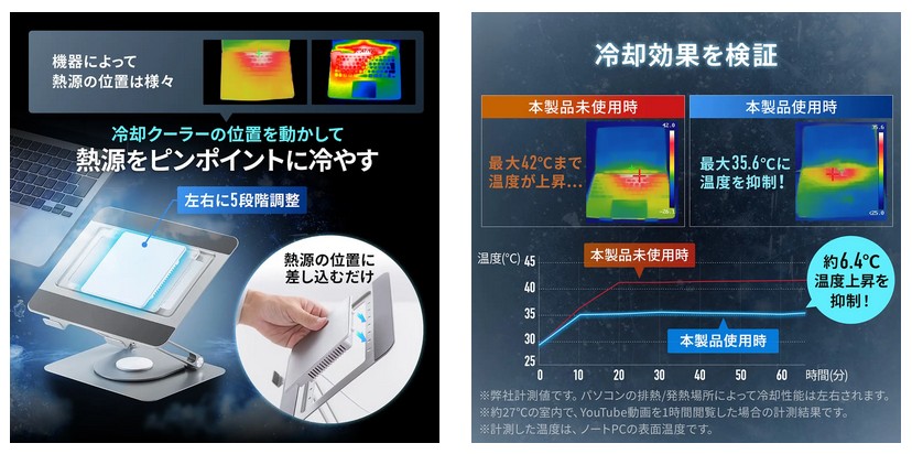 パソコンやタブレットの熱源は機種により異なる。そこで本製品は、冷却プレートの位置を自由に調整できる。CPUやバッテリー部分など、熱の発生源を狙って効率よく冷却できる。