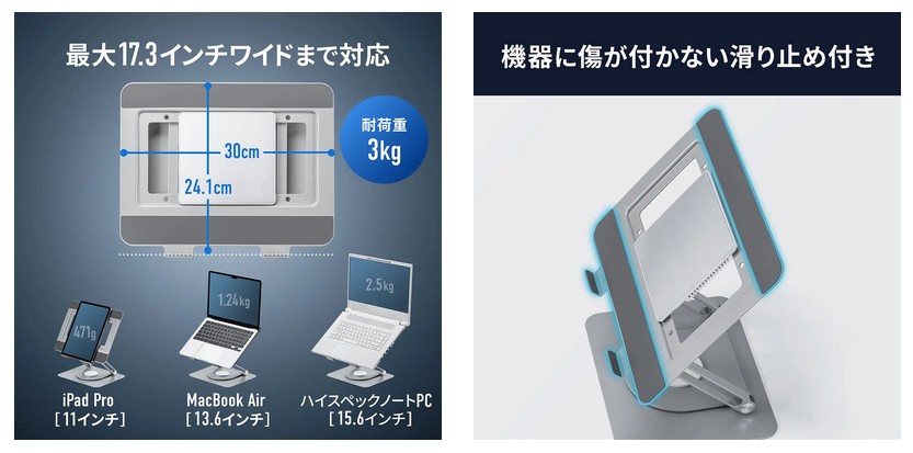 最大17.3インチまでのノートPCやタブレットに対応。重さ約2.3kgの安定感ある構造で、大型端末もぐらつかずにしっかり支える。滑り止めストッパーも装備し、機器の落下を防止。見た目以上にタフなスタンドだ。
