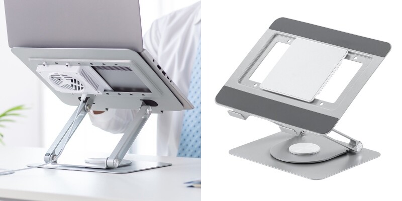 作業環境に合わせて、スタンドの高さと角度を細かく調整できる。2つの関節でなめらかに動き、理想の姿勢を実現する。さらに、台座は360度回転式。どんなワークスペースにもフィットし、Web会議やプレゼンにも便利だ。