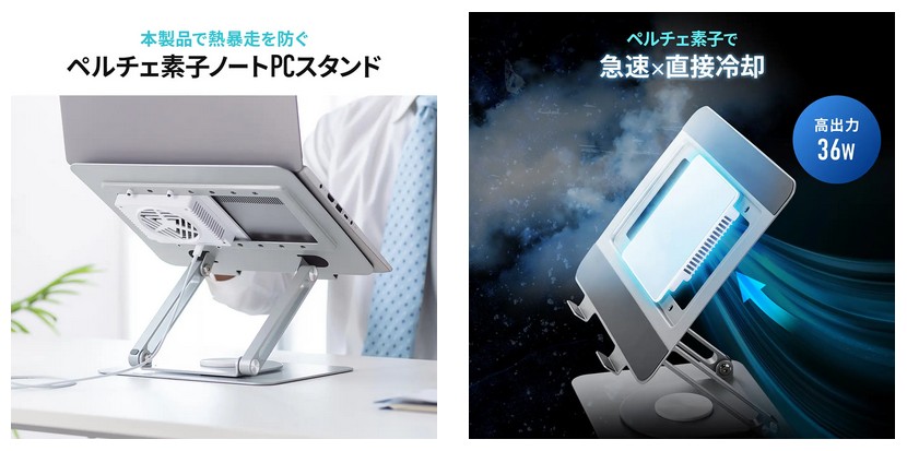 サンワサプライ株式会社が運営している直販サイト『サンワダイレクト』は、17.3インチ対応スタンドで高さ・角度・向きを無段階調整できるペルチェ素子で熱源を瞬間冷却、熱暴走を防ぐノートPCクーラー「400-CLN039」を発売した。