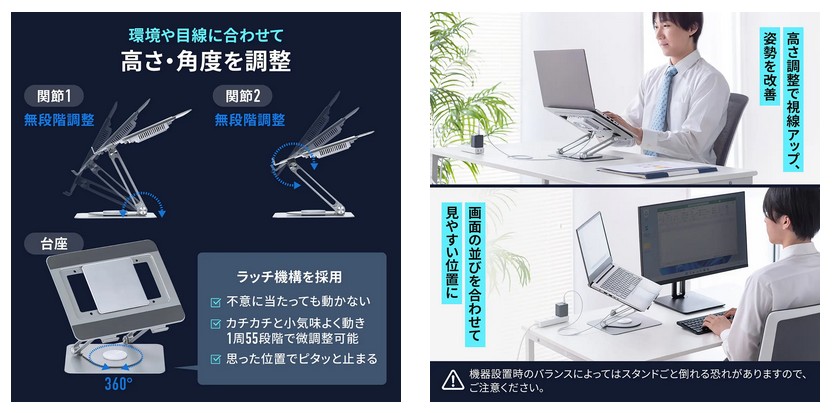 ■高さも角度も回転も思いのまま!無段階調整スタンド