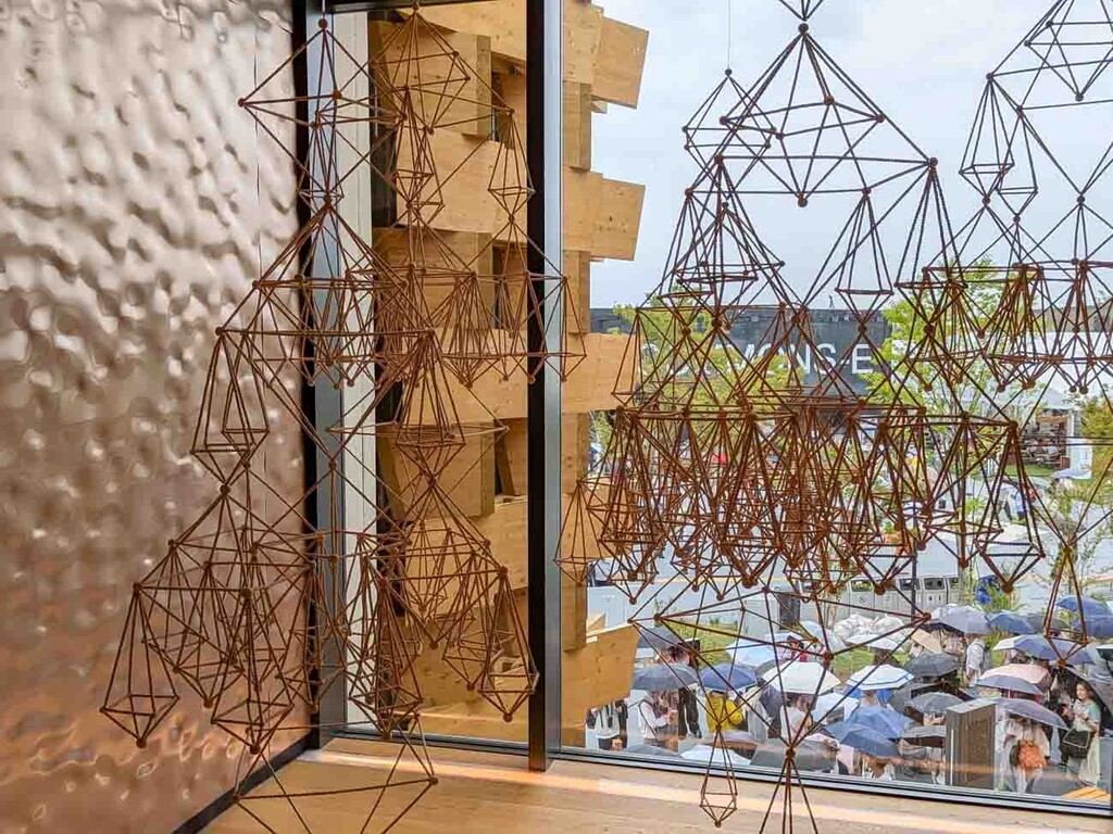 ポーランド館の入口では、日本の伝統的な木組み技術「Kigumi Koho」に通じる構法を参照しながら、波打つように曲線を描く木製の壁が来場者を出迎える。日本とポーランド両国の木造建築文化への敬意を込めたデザインであり、館全体を貫く「創造の波」というテーマを象徴している。