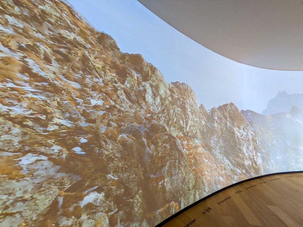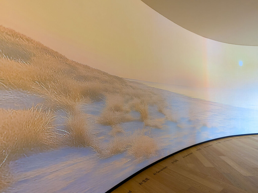 来場者の動きに連動してリアルタイムで風景が変化するAI生成映像。山岳、草原、海岸などの風景がダイナミックに投影され、まるで“ポーランドの大地を歩いているかのような”没入体験ができる。