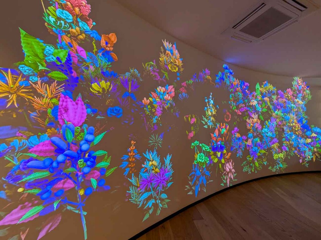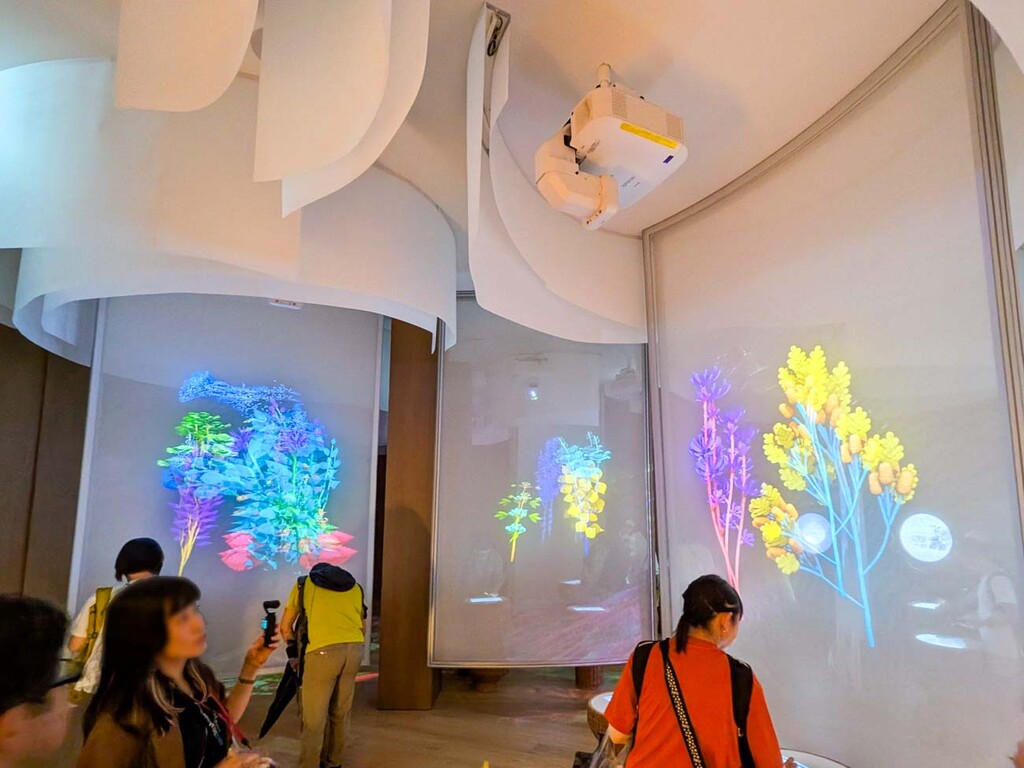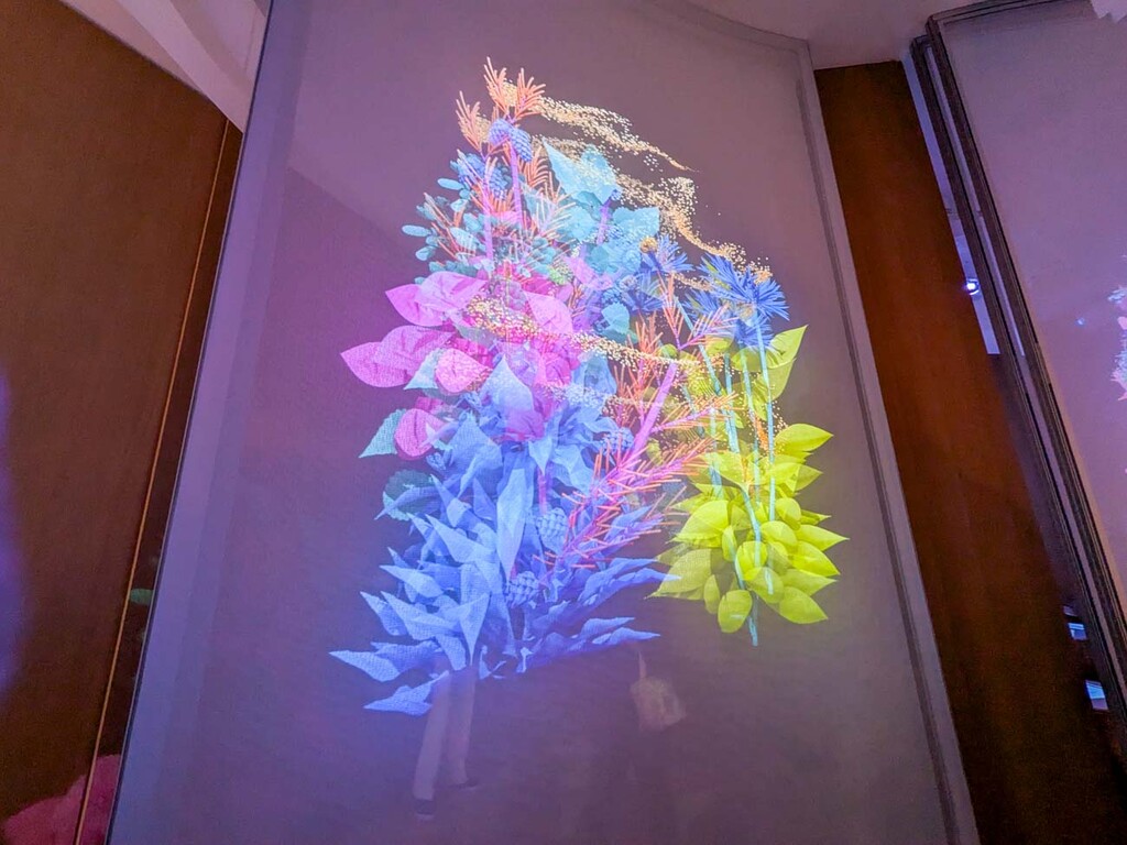 「Spirit Plant」で生成された薬草のデータが大画面に反映され、他の来場者と“共創”するギャラリーとして展示が更新され続ける。来場体験が作品として残る、循環型アートの試みだ。