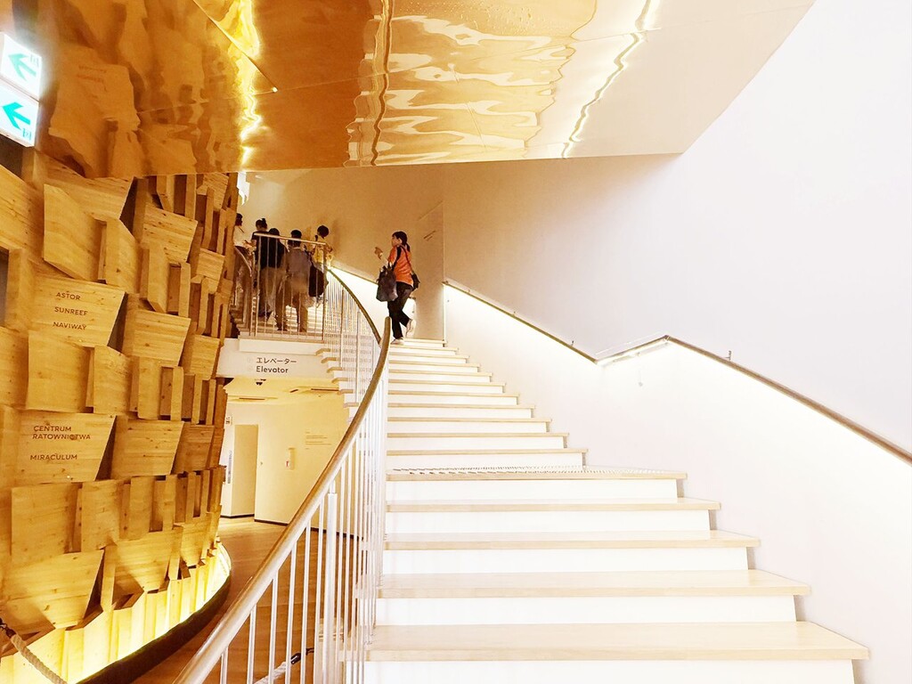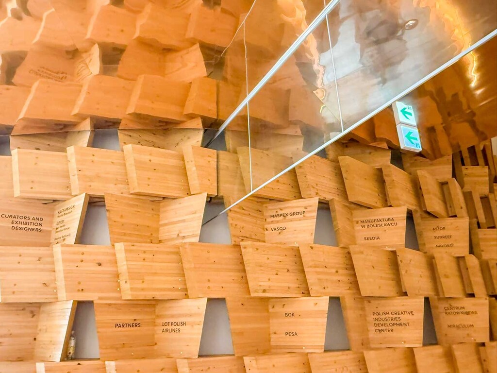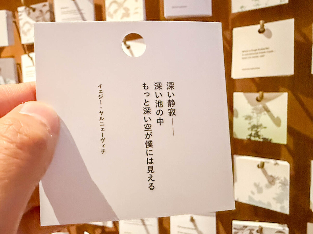 館内の壁面に若手詩人の詩句が掲出され、来場者はその一部を紙詩カードとして持ち帰ることができる。文化・言語・詩的表現を空間に織り込む演出に、ポーランドならではの文学的感性が光る。