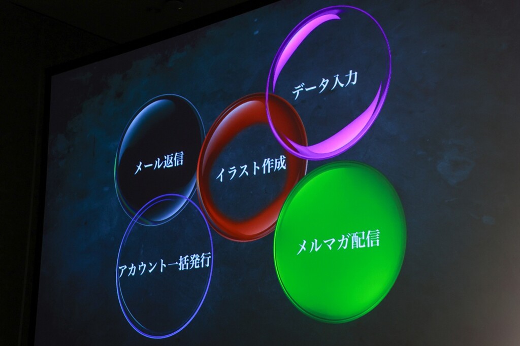 「SAMURAI」の使用例としては、「たとえばメールの返信、新入社員のアカウント発行や、退職社員のアカウント削除、メルマガ用のイラスト作成が必要な場合には、その作成から配信までを任せることができます。さらに、手間のかかるデータ入力業務においても、データの収集・入力、そして上司への報告までを『SAMURAI』に一任することが可能です。