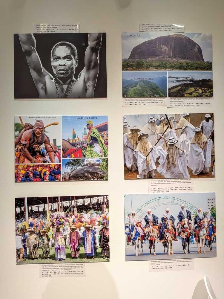 また、ズマ・ロックやマンビラ高原などの自然景観、オジュデ・オバやヌゼム・ベロムなどの伝統祭の写真も展示され、ナイジェリアの文化的多様性を感じられる構成となっていた。