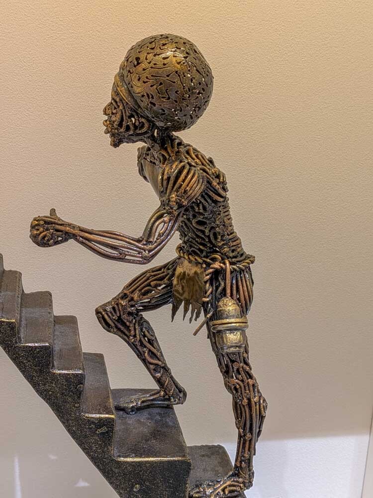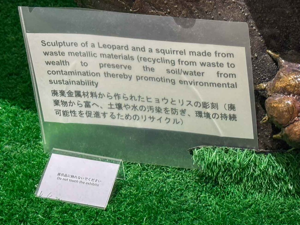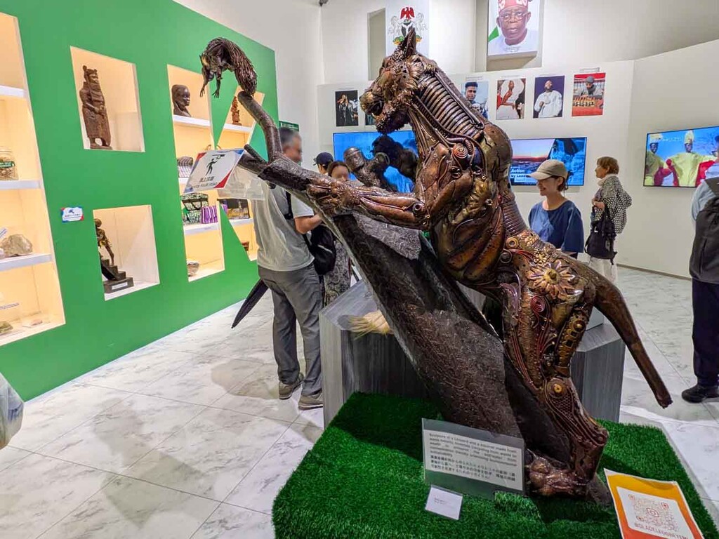 会場では、廃棄金属素材を再利用して作られたヒョウとリスの彫刻作品が展示された。英語で“From Waste to Wealth(廃棄物から富へ)”と題されたこの作品は、リサイクルによって土壌や水の汚染を防ぎ、環境保全と経済創出を両立させるというメッセージを伝えている。また、ヒョウはナイジェリアの力強さも表現しているのだそう。