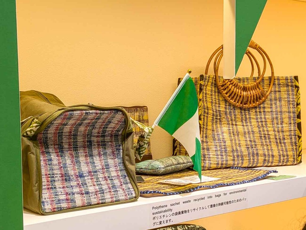 また、ポリエチレンの廃材を再利用した手提げバッグや、地元産素材を活用した編み込み工芸バッグも紹介され、循環型経済の実現に向けた地域の取り組みが視覚的に表現されていた。