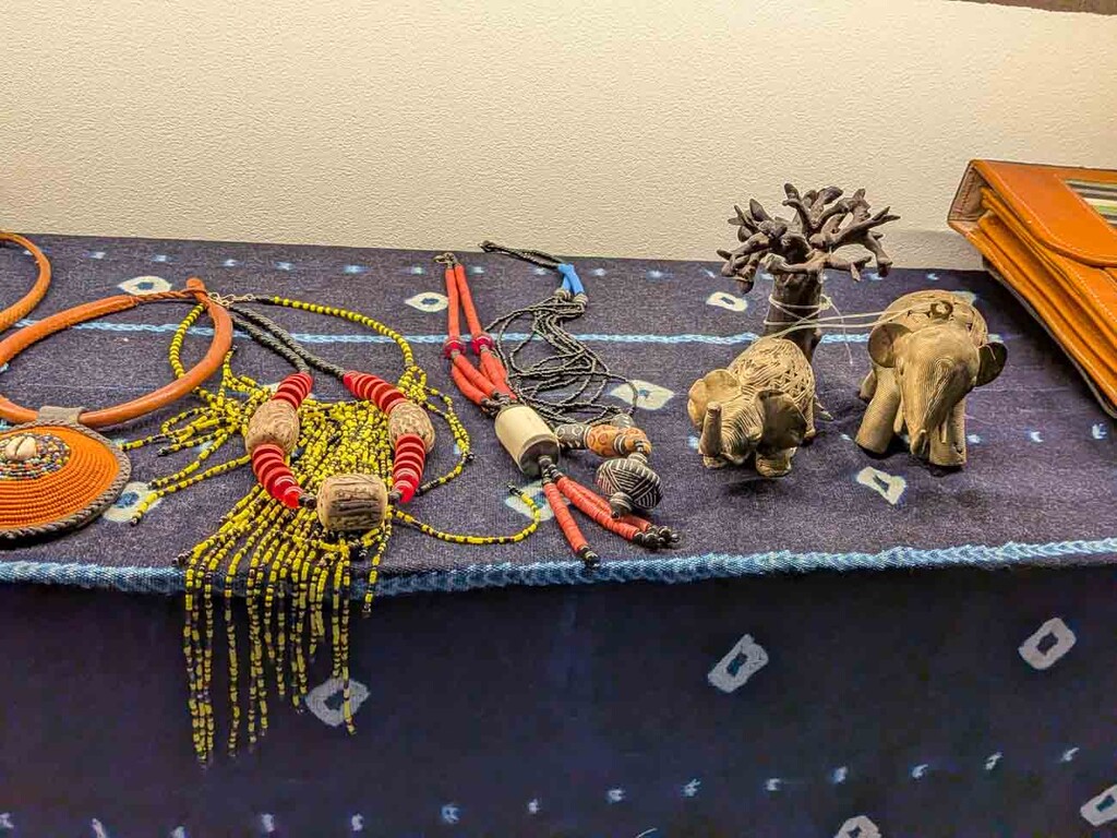 ビーズや木彫り、藍染め布など、多民族国家ならではの装飾品が多数展示されており、それぞれの形や模様に込められた意味が見る者の想像力を掻き立てる。