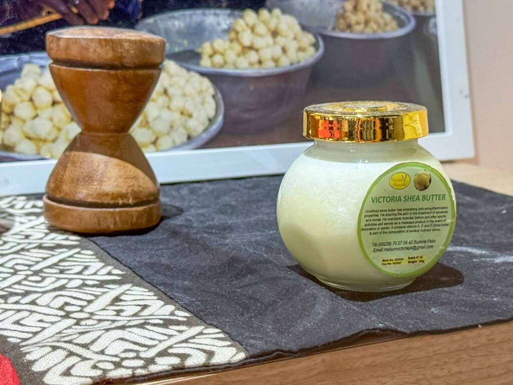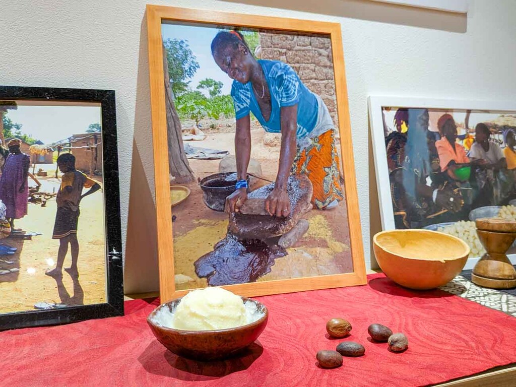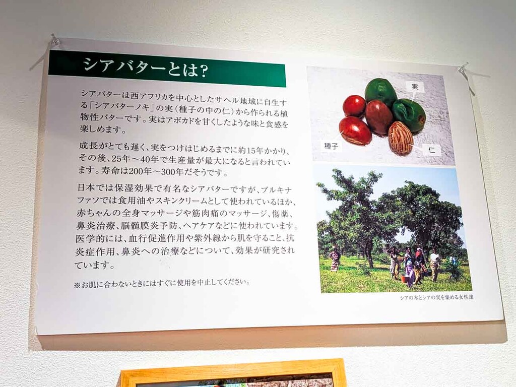 サヘル地域に自生する「シアバターノキ」の実から採れる植物性バター。ブルキナファソでは食用油や薬用クリームとしても使用されており、日本でも保湿クリームとして有名だ。会場では、シアの実・種子の実物写真や使用例が掲示され、長寿命の木であることも紹介されている。
