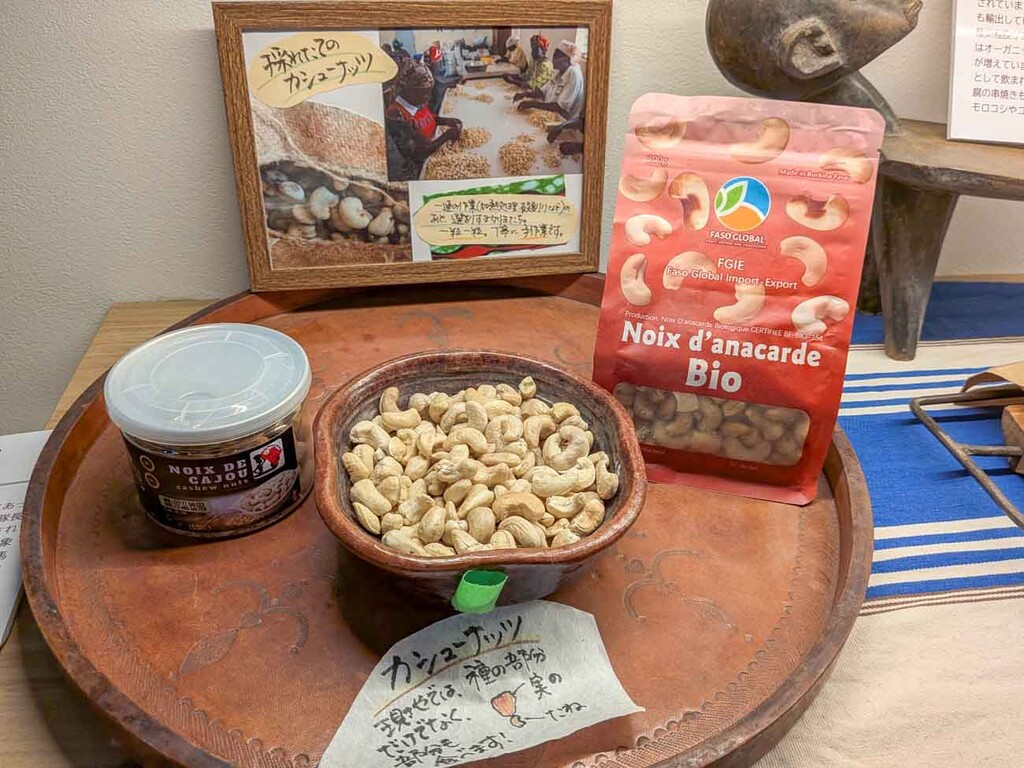 「天の贈り物」とも称されるブルキナファソ産のカシューナッツも展示。有機認証を受けた「Noix d’anacarde Bio」などのパッケージが並び、輸出産品としての存在感を示していた。