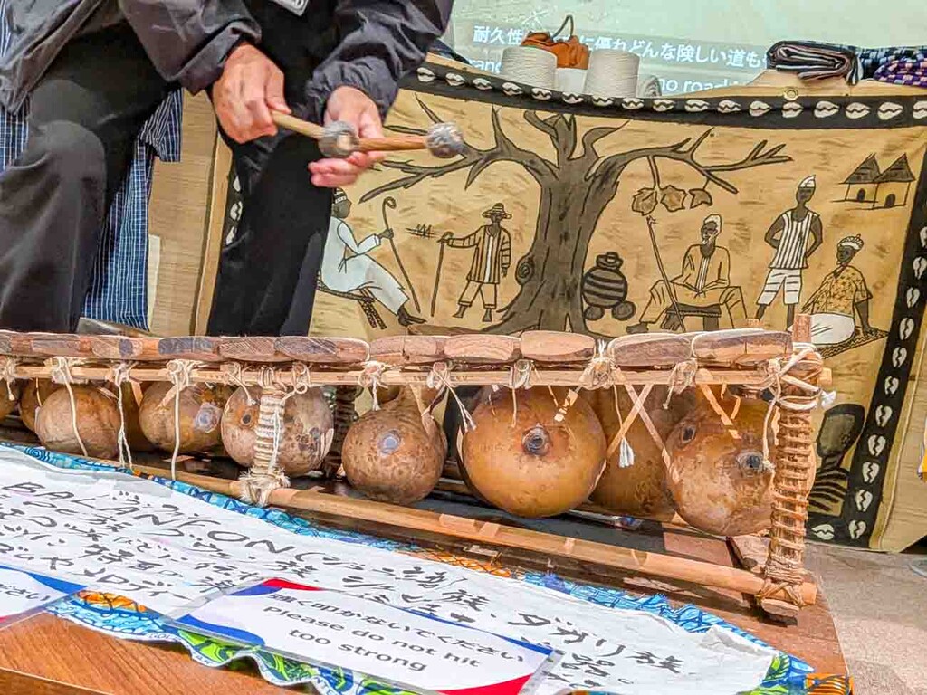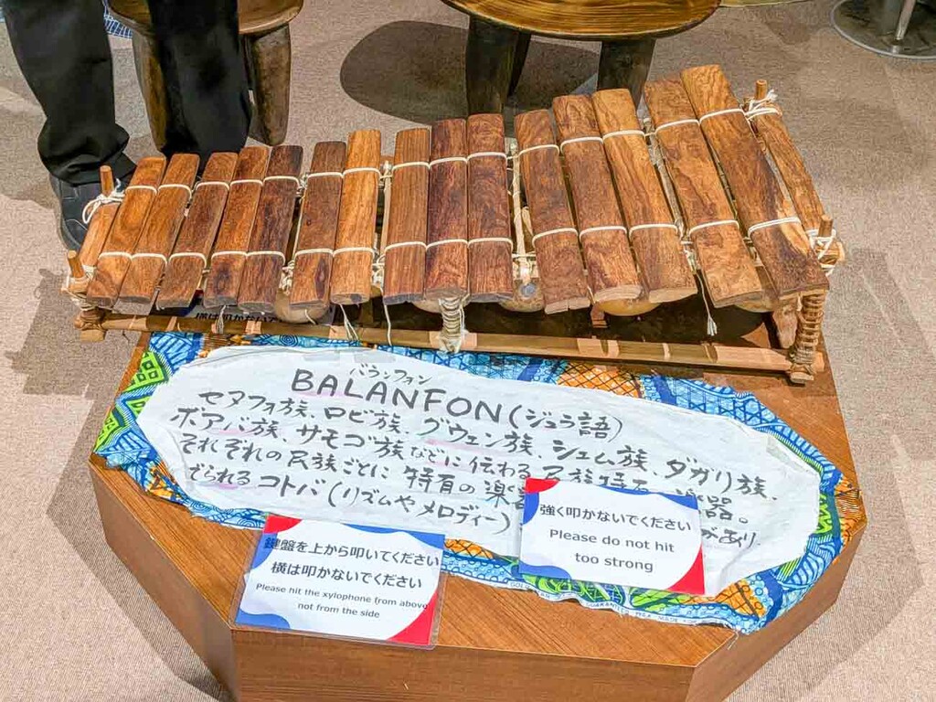 複数の民族に伝わる伝統木琴で、木製鍵盤の下にはひょうたんが共鳴器として使われている。セタフォ族、ロビ族、グウェン族など各部族によって音階やメロディーが異なるという。展示では「鍵盤を上から叩いてください」という注意書きもあり、体験型展示として多くの来場者が足を止めていた。