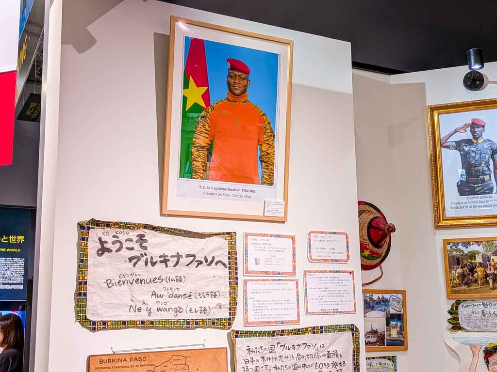 ブルキナファソ(Burkina Faso)は「高潔な人々の国」という意味をもつ西アフリカの内陸国で、首都はワガドゥグ。多民族国家であり、農業や手工芸を中心とした社会経済を形成している。現大統領はイブラヒム・トラオレ氏(Captain Ibrahim Traoré)で、展示ブースにはその肖像画も掲げられていた。