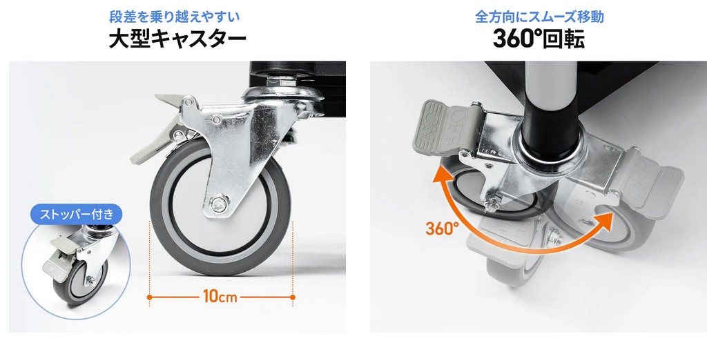 100mm径のTPRキャスターを4輪すべてに装備し、滑らかで静かな走行を実現した。前輪は360度回転で小回りが効き、後輪にはストッパー付き。段差にも強く、倉庫やバックヤードでもストレスなく使える。