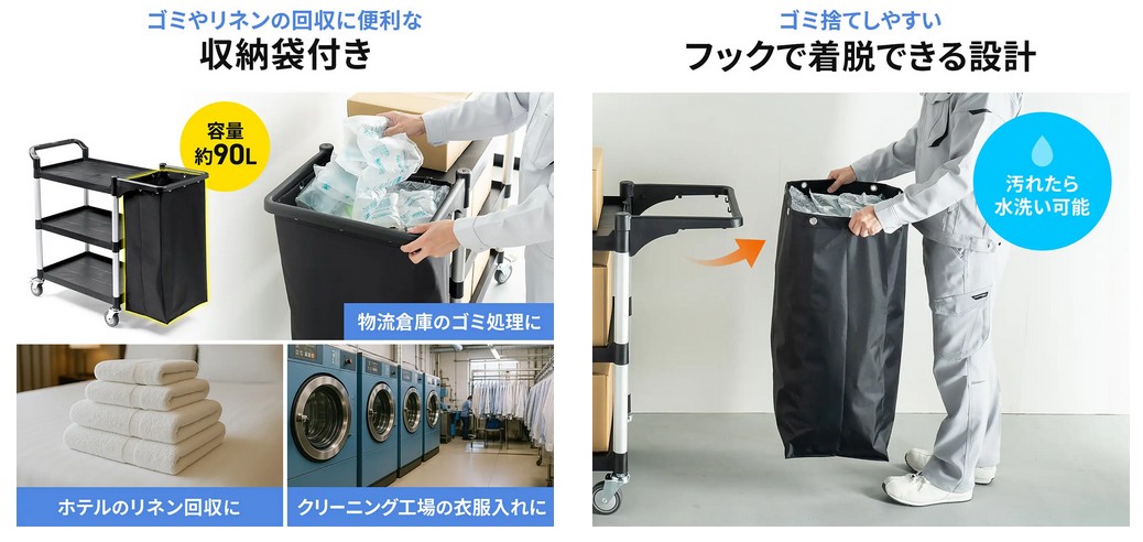汚れやすいリネンやゴミを入れても、収納袋は取り外して丸洗いできる。防水性に優れたターポリン素材を使用しており、衛生面が求められるホテルや飲食店などでも安心で、使い終わった後のお手入れも簡単だ。