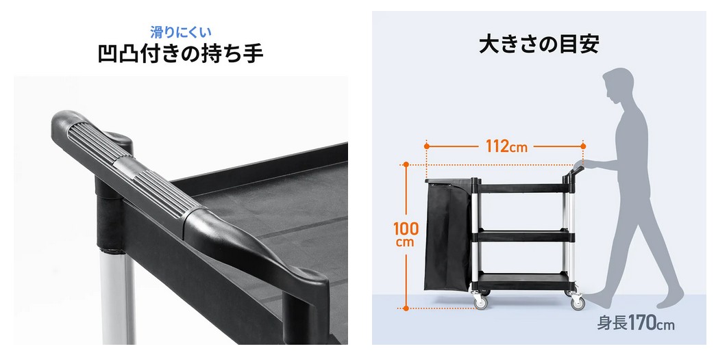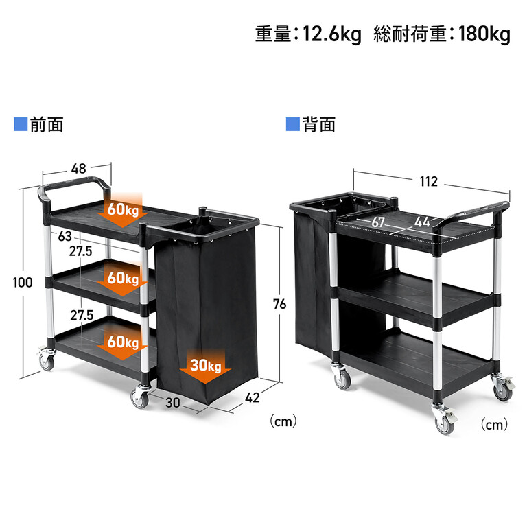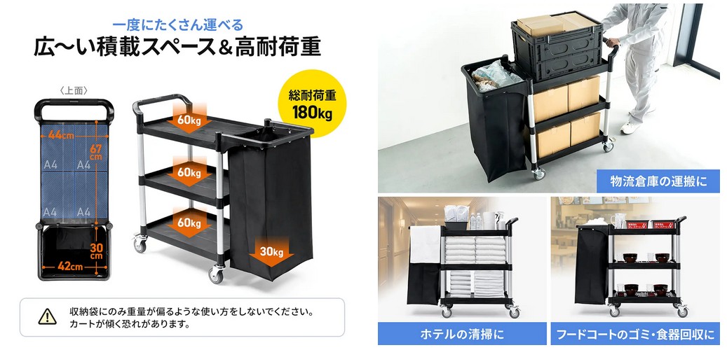 3段トレイと大容量90Lの収納袋を搭載したツールワゴン。清掃用品、食器、資材などを一括でまとめて運べ、作業効率が格段にアップします。各トレイは60kg、袋は30kgまで対応するため、業務用として安心して使用できる。