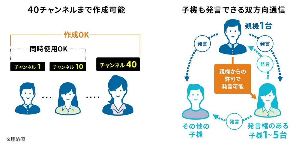 1人の声を一斉に送信できるツアーガイドシステム。1チャンネルにつき最大255人、同時に最大10チャンネルを使用できる。※数値は理論値。通信環境や状況によって異なる。