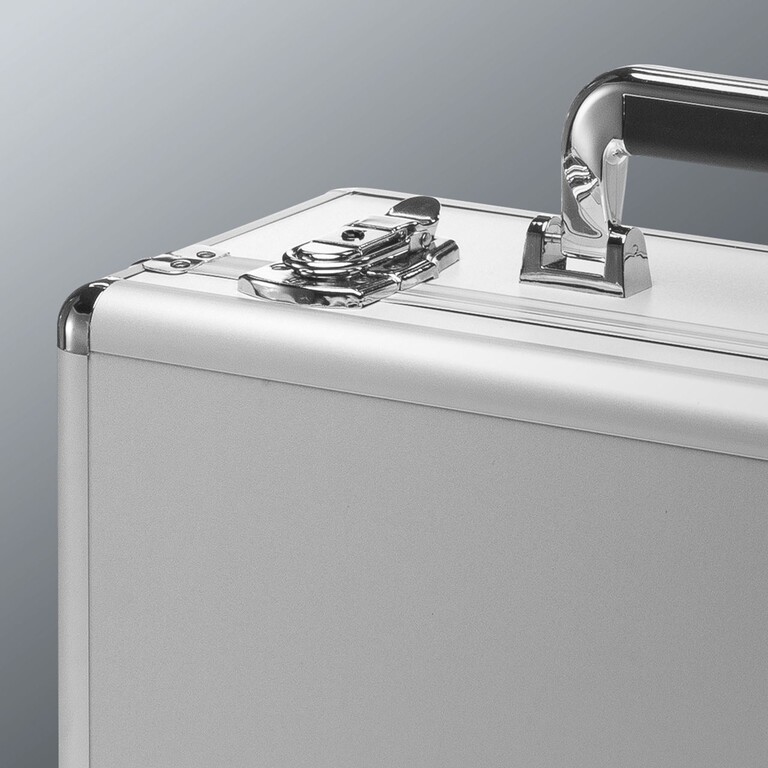 ワイヤレスガイドシステムと機器一式を、すっきりとひとまとめに収納できるアルミケース。持ち手付きで、持ち運びにも便利だ。