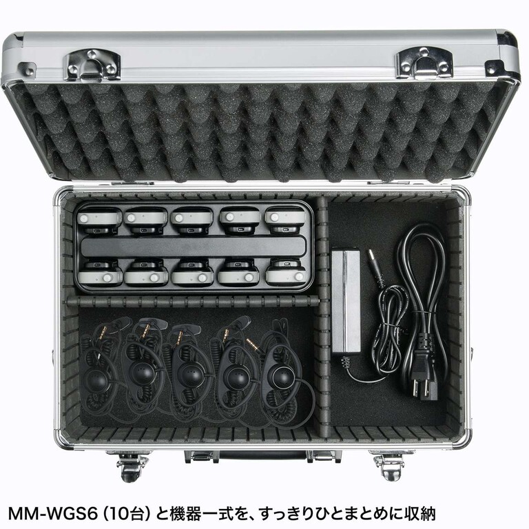 サンワサプライ株式会社は、ツアーガイドや工場見学、作業現場などでクリアな双方向音声ガイドを実現するワイヤレス音声通信システム「MM-WGS6」と、システム本体や充電器を安全に持ち運べる専用アルミケース「MM-WGS6-BOX1」を発売する。システム本体の「MM-WGS6」では、大好評ワイヤレスガイドシステムがグレードアップして登場だ。