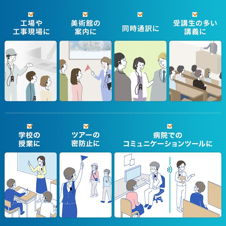工場見学や作業現場などの周りの音が大きい場所や、学校や病院などのマスクをしたまま会話する場所に便利だ。