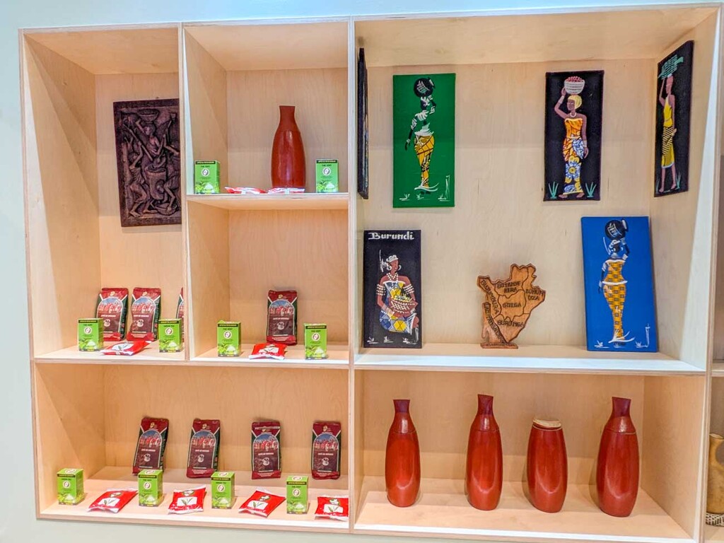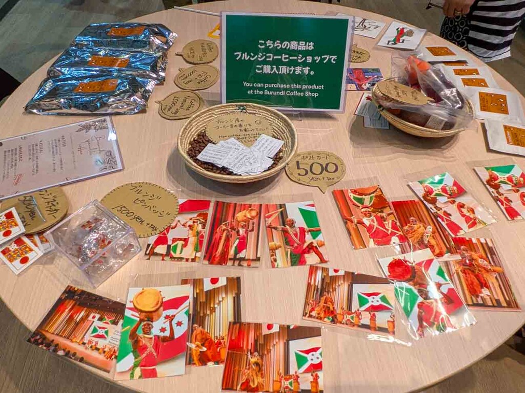 展示棚には、「ブルンジの女性たちの日常」を描いたカラフルな絵画や、ブルンジの地図を模したウッドアートなども並べられており、アフリカ内陸国としてのブルンジの暮らしや誇りを感じさせる構成となっている。