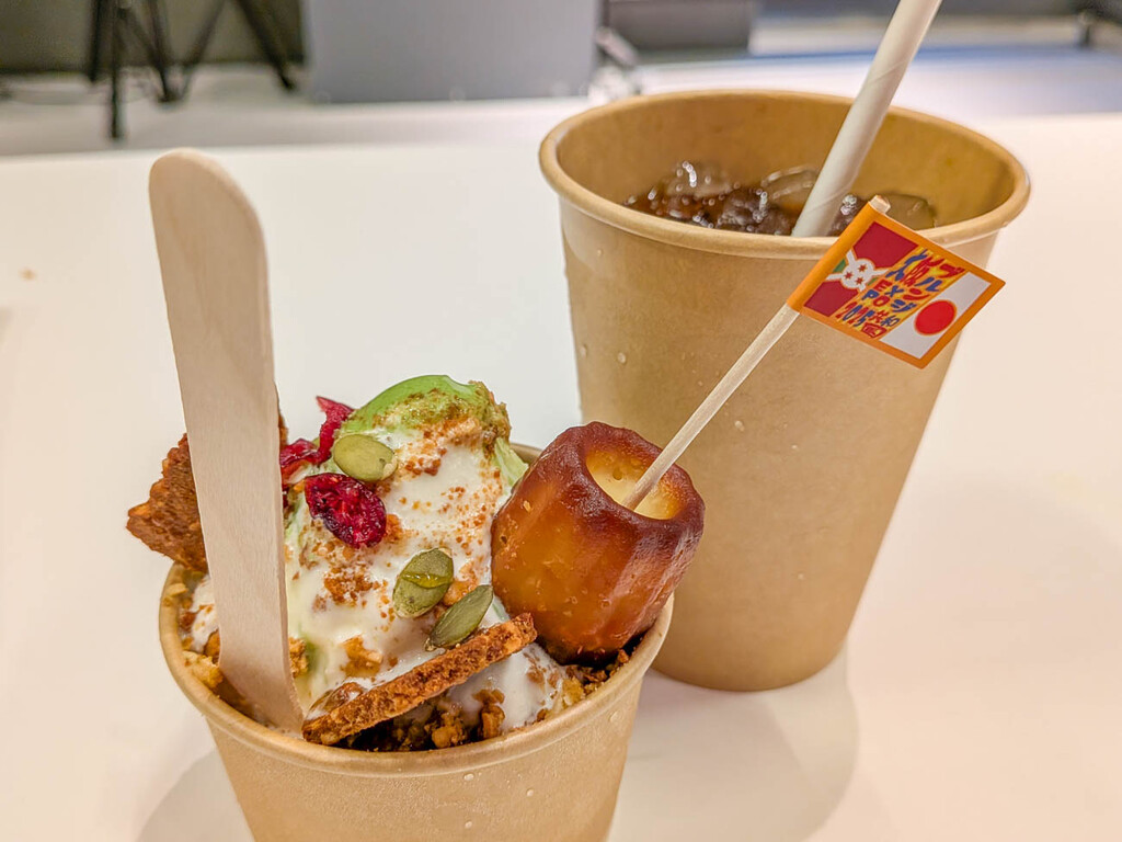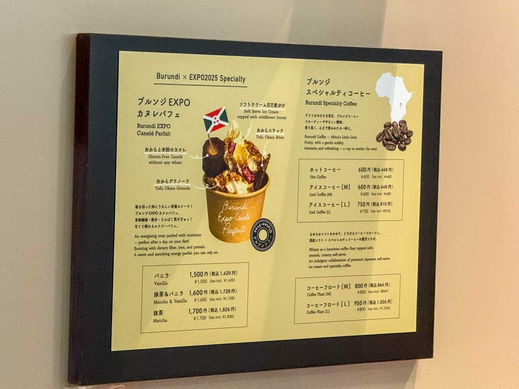 ブルンジ館の最大の目玉は、淹れたてのスペシャルティコーヒーと、アップサイクル素材を用いて作られた万博限定スイーツ「ブルンジEXPOカヌレパフェ」だ。