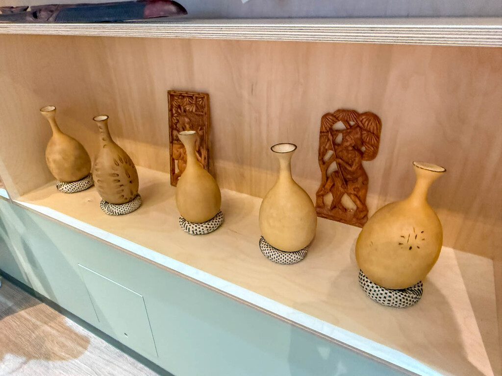 木彫りのパネルやひょうたんの装飾品、カラフルな布製のワニの人形など、ユーモアと伝統が融合した展示物が並び、来場者の足を止めている。