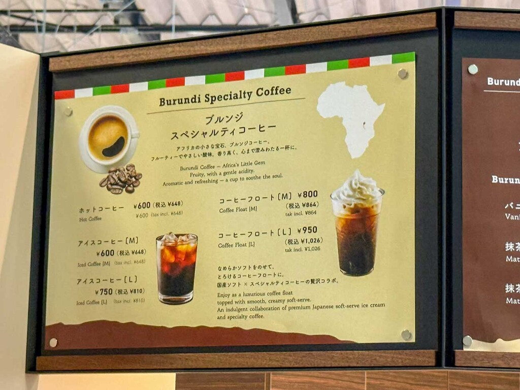 コーヒーは、ブルンジ産のアラビカ豆を使用した、フルーティーで香り高い一杯である。ホット・アイスともに1杯600円(税込648円)からと手頃な価格で提供されており、コーヒー通からは「ブルンジが断トツ」と評されるほどの逸品だ。ドリップバッグ(540円)などのお土産商品も販売されている。