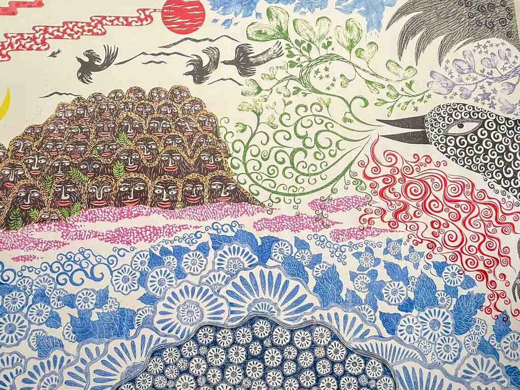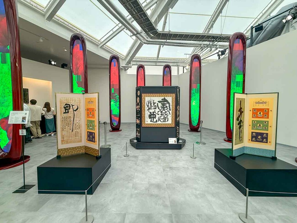 和歌山ブースのテーマは「和歌山百景―霊性の大地―」。漆塗りの映像トーテムやパイル生地のソファ、一枚板のカウンターなど、県産の素材や伝統技術を用いた空間演出が印象的である。番留京子氏による版画や、子どもたちによる押し花アートが展示された壁面も相まって、まるで森の中に迷い込んだかのような静謐な雰囲気が漂っている。
