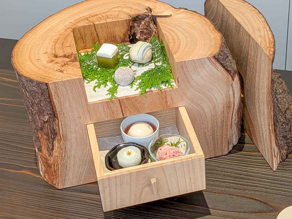 和菓子は6種類、ドリンクは2種から1杯を選べる豪華なセットであり、特注の木製器に美しく盛り付けられている。外観は丸太そのもので、引き出し付きの器には、上段と下段にそれぞれ3種ずつの和菓子が配置されている。