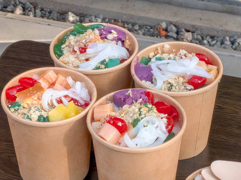 フィリピン語で「混ぜ混ぜ」を意味するハロハロは、煮豆やゼリー、フルーツ、紫芋のウベアイスなどが層になった豪華なスイーツであり、見た目にも楽しく、食べ応えも十分である。