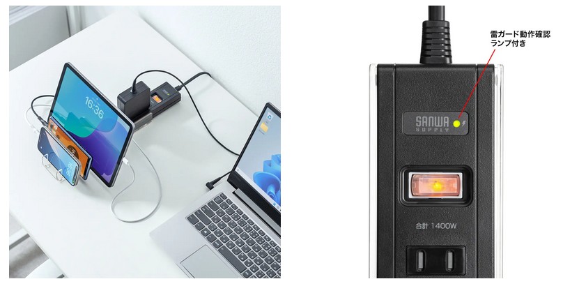 内部に雷ガードを搭載しており、落雷などによる過電流から接続機器をしっかり保護する。雷ガード作動中は確認ランプが点灯し、機能の状態をひと目で確認できる。