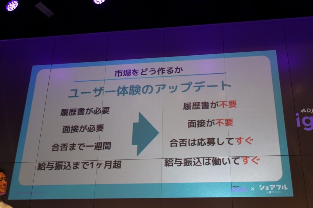 アプリの立ち上げを通して、新たな市場開拓に挑んだのが、単発・スキマバイトアプリの「シェアフル」だ。シェアフル株式会社のCMO・浜野 善輝氏によると、「従来は、応募して、面接して、働いて、1ヶ月後に給与が振り込まれる、というのがアルバイトの流れだった。浜野氏は「人材業界のステレオタイプを捨てて、スキマバイトという市場を作る必要があった」と語る。面接を省略し、一定の条件に達している応募者を自動採用するというシェアフルが生み出したシステムは、時代のニーズに応え、大きな支持を集めることとなった。