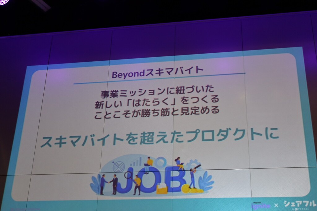 浜野氏は「今後の成長のカギはコンパウンド型プロダクトにある」という。コンパウンドとは、複数のものを混ぜ合わせ、新しい性質や機能を持たせることをいう。「シェアフル」の場合は、スキマバイトに加え、ポイ活、クーポンといった金銭に類似するものを得られる機能を実装した。浜野氏は「スキマバイトというユーザー獲得チャネルを起点とし、サービスの複層化を実現することで、LTV(顧客生涯価値)の向上を狙っている」と述べた。「シェアフル」の現在進行形の目標は、スキマバイトを超えたプロダクトになることだ。
