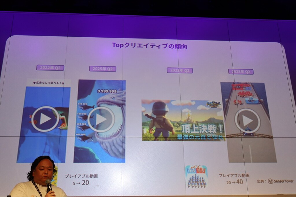 パク氏は、最新のアプリ市場では「ユーザーの量より質が重要になっている。ユーザーに、アプリの内容を理解させてからダウンロードさせる方向に向かっている」と語る。それが顕著に表れているのが、アプリのダウンロードを促す広告やランディングページだ。ゲームアプリでは「フィッシュダム」「トップウォー」といった人気アプリの広告で、プレイアブル動画を活用したものが増加。「フィッシュダム」は、2022年から2025年の間に、その数を4倍に増やしている。
