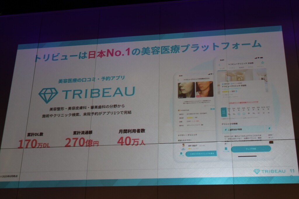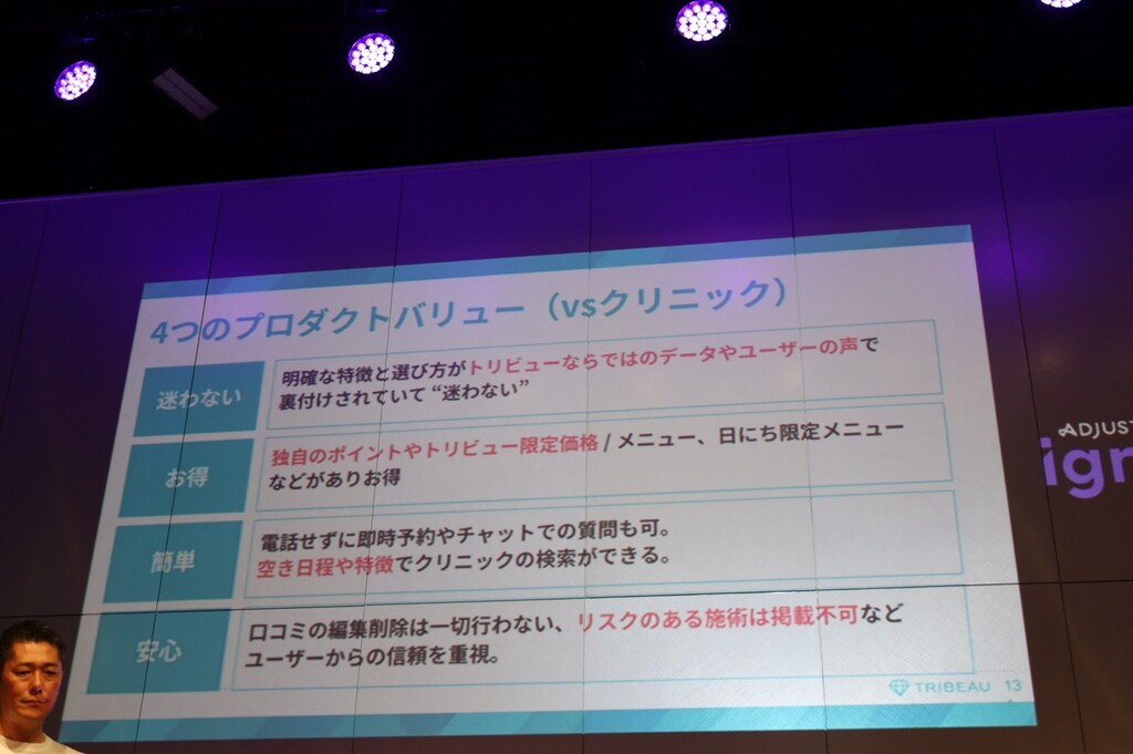 その後「トリビュー」は、アプリ予約限定の施術メニューやポイント機能などを実装したことで予約アプリとしての強みを得て、マネタイズに成功。ライト層の多い美容皮膚科ジャンルにも手を広げ、ユーザーを拡大している。現在の「トリビュー」について、毛氏は「4つの強みとして、迷わない、お得、簡単、安心を掲げ、『受けるべき施術、行くべきクリニックがわかる』サービスを目指している」と語る。また、運用の見直しによる効率化も進めているといい「KPIを変えたら単月で2000万円の利益改善が起きた事例もあった」という。毛氏は「今後は送客プラットフォームとして成長し、自由診療の総合プラットフォームになりたい」と野望を述べた。