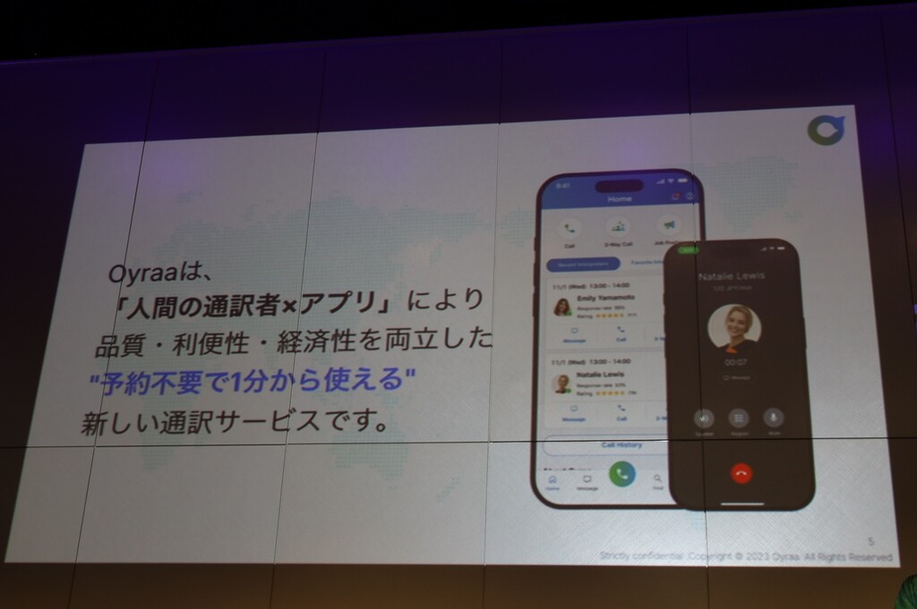逆に、非AIを強みにしているのが、翻訳アプリの「Oyraa」。このアプリを利用すると、プロの通訳者をすぐに呼び出すことが可能で、電話、オンライン会議、ビジネスの現場での通訳を依頼できる。世界153カ国、3100人の通訳者と提携しており、24時間365日のニーズに対応。料金は1分単位の従量課金なので、費用も明瞭だ。