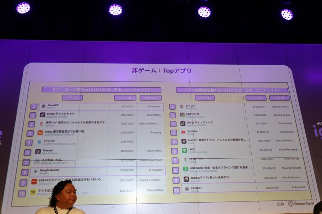 パク氏によると、非ゲームアプリのトレンドは「とにかくAI」。多くのエンタメアプリが成長した2025年上半期にあって、非ゲームアプリのなかで最もダウンロードされたのが「ChatGPT」だ。「ChatGPT」は売上でも10位にランクインしており、AIの一般化が進行していることが窺える。パク氏はこの傾向について「非ゲームアプリの市場動向には、ユーザーの生活動態の変化が強く現れる」と述べた。