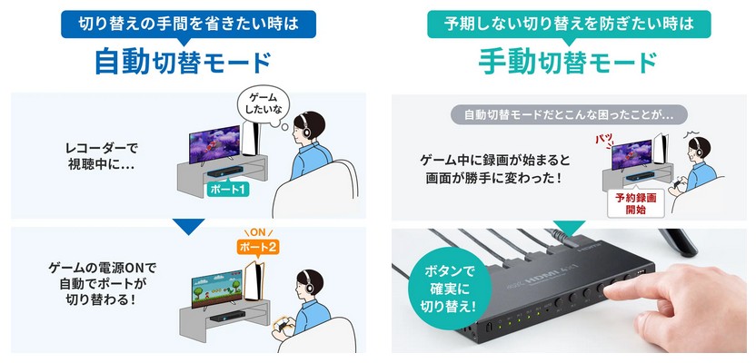 HDMI機器起動時に自動でポートを切り替える「自動切替モード」と、ボタン切り替えのみで操作し誤作動を防ぐ完全手動切替モードを選べる2WAY方式だ。