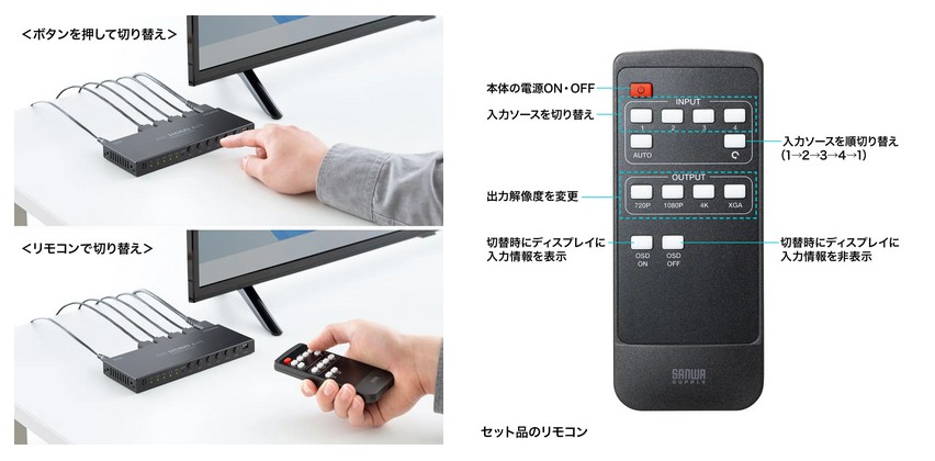 簡単に切り替え出力できるHDMI切替器「SW-UHD41RSL」